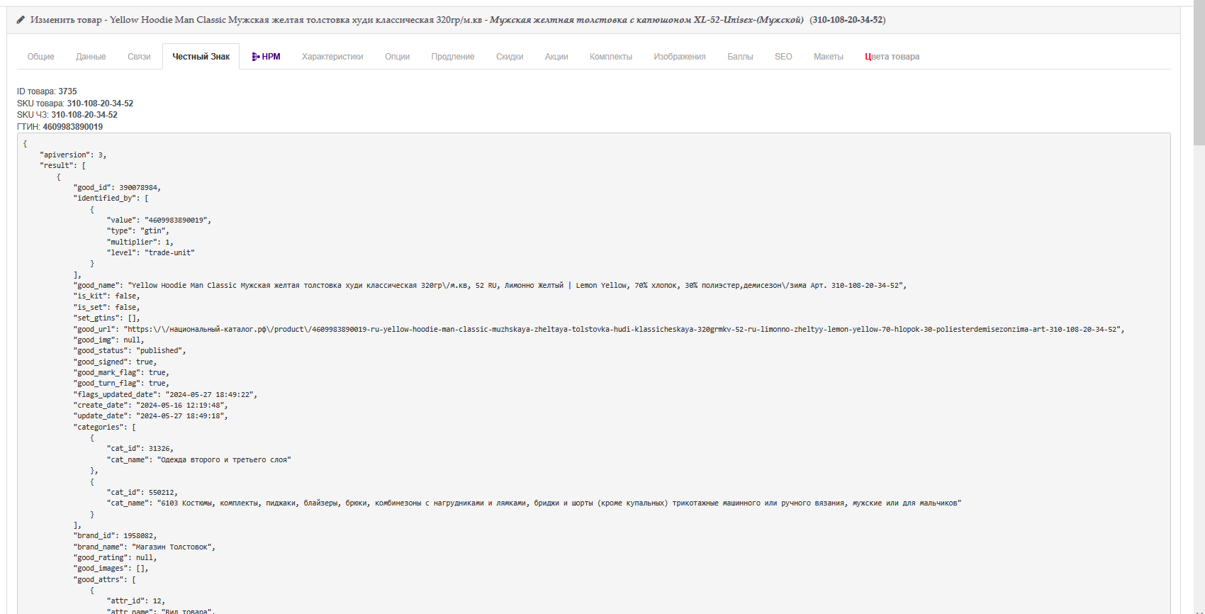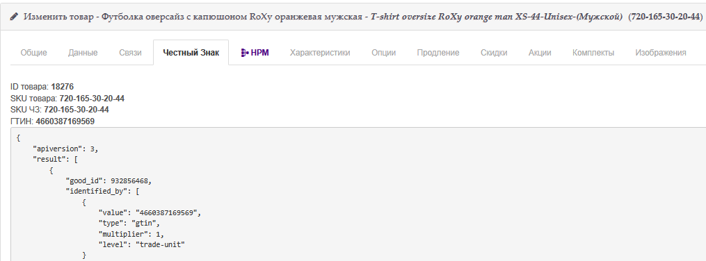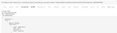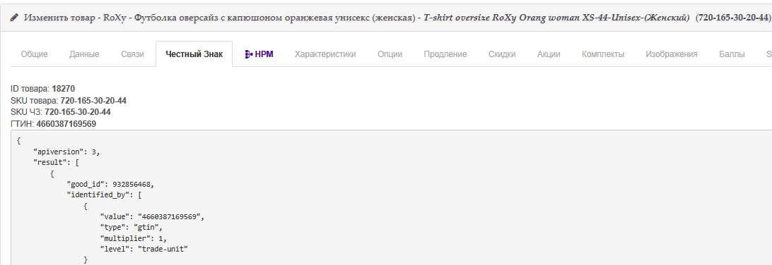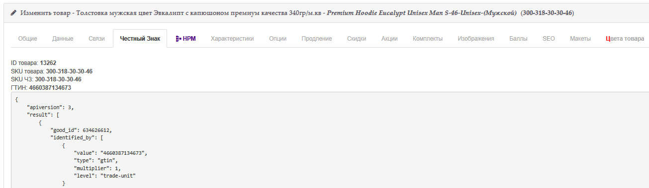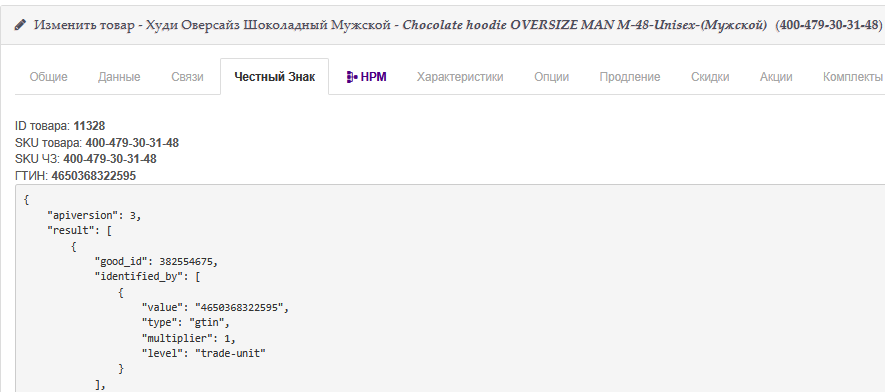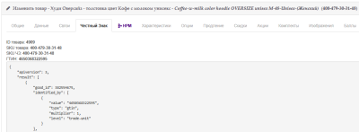 Cкриншот выше - карточка товара в панели управления интернет магазином, сделали специальную вкладку на которой выводится информация о Честном Знаке для этого товара.