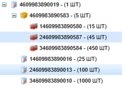 • 0 - Тип упаковки. На скришноте выше, из личного кабинете GS1RUS отсутствует первая цифра, и GTIN состоит из 13 цифр(далее GTIN-13). Для такого GTIN-13 не указанна информация о транспортной упаковке, это "базовая единица", которая описывает единицу товара =1шт. Одна единица товара может быть сложенна в транспортную упаковку, к примеру в одной упаковке может быть 5 ед. батончиков, при этом каждый батончик имет свой GTIN-13 . В примере с конфетами будет указан тот же групповой GTIN, но начинаться он будет с первой цифры  указывающей на упаковку - так мы получаем GTIN-14 . Важно понимать что вложенные единичные GTIN-13 в транспортную упаковку  GTIN-14  имеют тот же характер маркировки(те же цифры). Нарисовал первую цифру для  GTIN-14  , другим цветом. Подытожим: если на вашем GTIN всего 13 цифр то это единичный товар GTIN-13, если на вашем гтин 14 цифр  GTIN-14  , то это сгруппированные в транспортную упаковку вложения. И дальше по иерархии вы можете сложить одну транспортную упаковку в следующую и получившуюся групповую упаковку сложить в еще одну и так далее. Насколько мне известно может быть до 8 вложенных транспортных упаковок. В качестве примера: сложим наши батончики в коробку конфет и первая цифра будет (1),коробки конфет сложим в один гофро-короб (2) , гофро-короба сложим на паллету (3), паллеты сложим в контейнер (4) , еще остаются цифры:), и наверно это будет морское судно загруженное контейнерами с нашими конфетами (5) . У меня не получилось придумать восемь вложений, но суть ясна. Давайте для нашего гтин (0) ({460}998389)(0019)  попробуем, для науки это проделать на стороне gs1rus нажимайте на изображения чтобы увеличить: