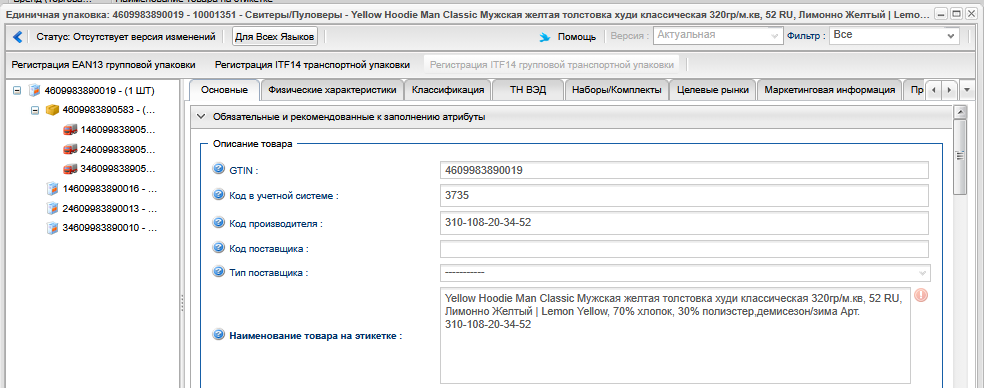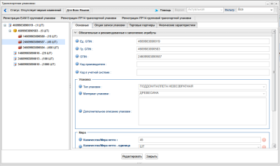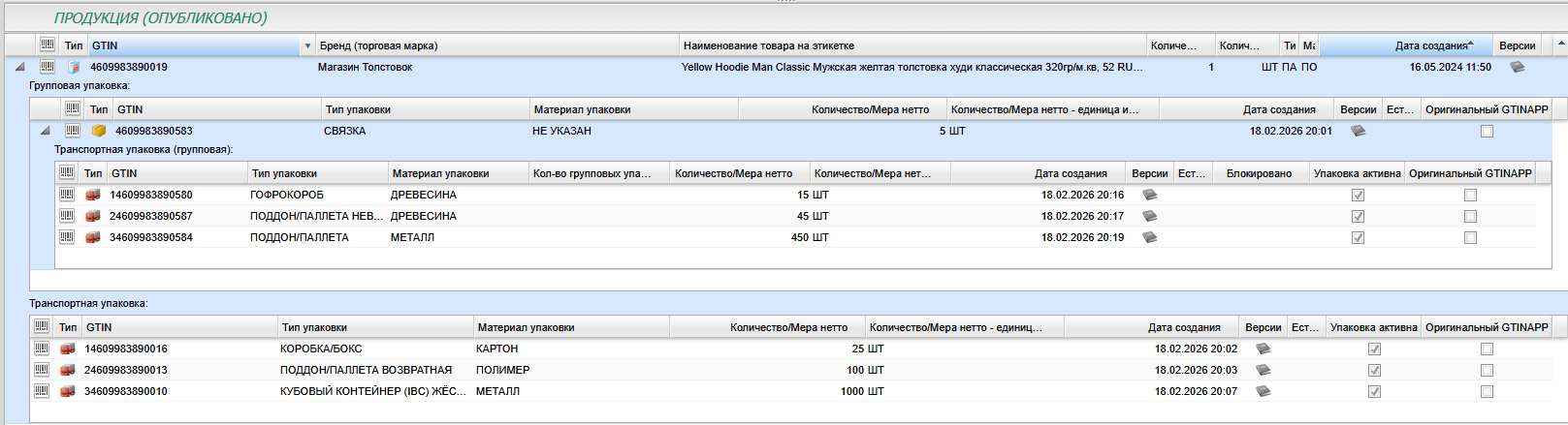 • Как вы видите, я ошибся и ошибочное зачеркнул: для GTIN-13 сложенных в транспортную упаковку выпускаются новые  GTIN-14  , а также транпортная упаковка не вкладывается в транспортную а содержит информацию о общем кол-ве товара в такой транспортной упаковке.  Все остальная информация верна. И моё личное мнение что, если бы при создании групповой и транспортной упаковки использовались бы те же цифры для   GTIN-14   что и для вложенных  GTIN-13 = это было бы замечательно и логично. Но система выпускает как видно на скриншотах новые GTIN для транспортной и групповой упаковки.