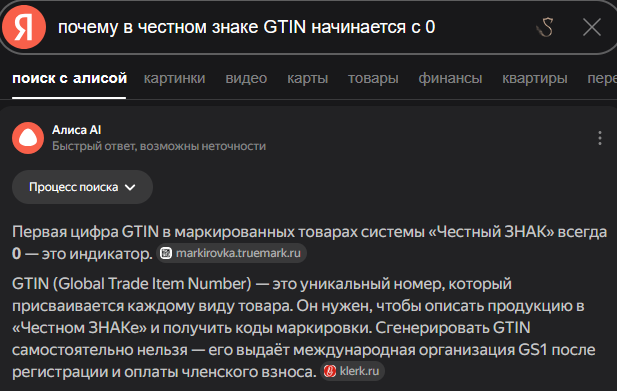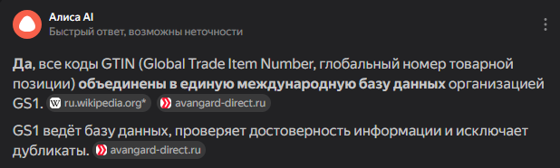 ГС1РУС в свою очередь является "подразделением", даже "подразделом" некоммерческой организации глобальной системы идентификации товаров GS1 AISBL. Тут нет никаких теорий заговора, я так описываю, чтобы сразу выделить структуру GS1, так как каждая страна-участник, имеет свой идентификационный номер в системе GS1. К примеру Российская Федерация имеет 46 номер, и все GTIN зарегистрированные на нашей территории будут начинаться с 46.  Диапазон кодов выделенный для России 460–469 ( несколько примеров:  000–019 — США, Канада; | 400–440 — Германия; | 479 — Шри-Ланка; | 481 — Беларусь; ). Таким образом все товары которым присвоен GTIN объедены в единую базу. ИИ Яндекс это подтверждает: