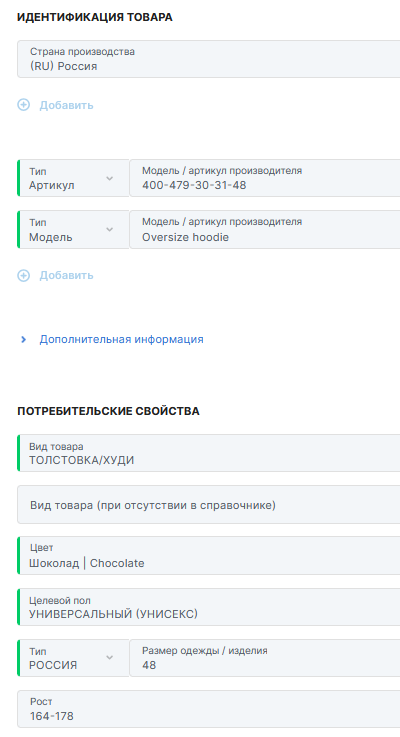 - SKU ЧЗ (Артикул или код производителя в Честном Знаке)